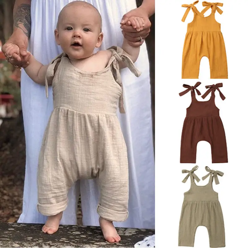 المنتجات ذات الصلة ل Rompers و الوليد طفل رضيع فتاة الرضع القطن الكتان رومبير بلون بذلة مع الذاتي أشرطة للربط الزي الملابس