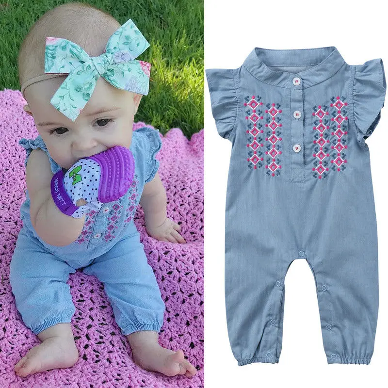 المنتجات ذات الصلة ل Rompers و الوليد الطفل فتاة رومبير الدنيم رومبير الكشكشة كم لينة الجينز الملابس طفل فتاة الملابس